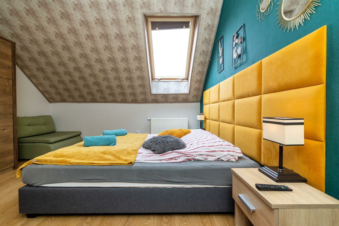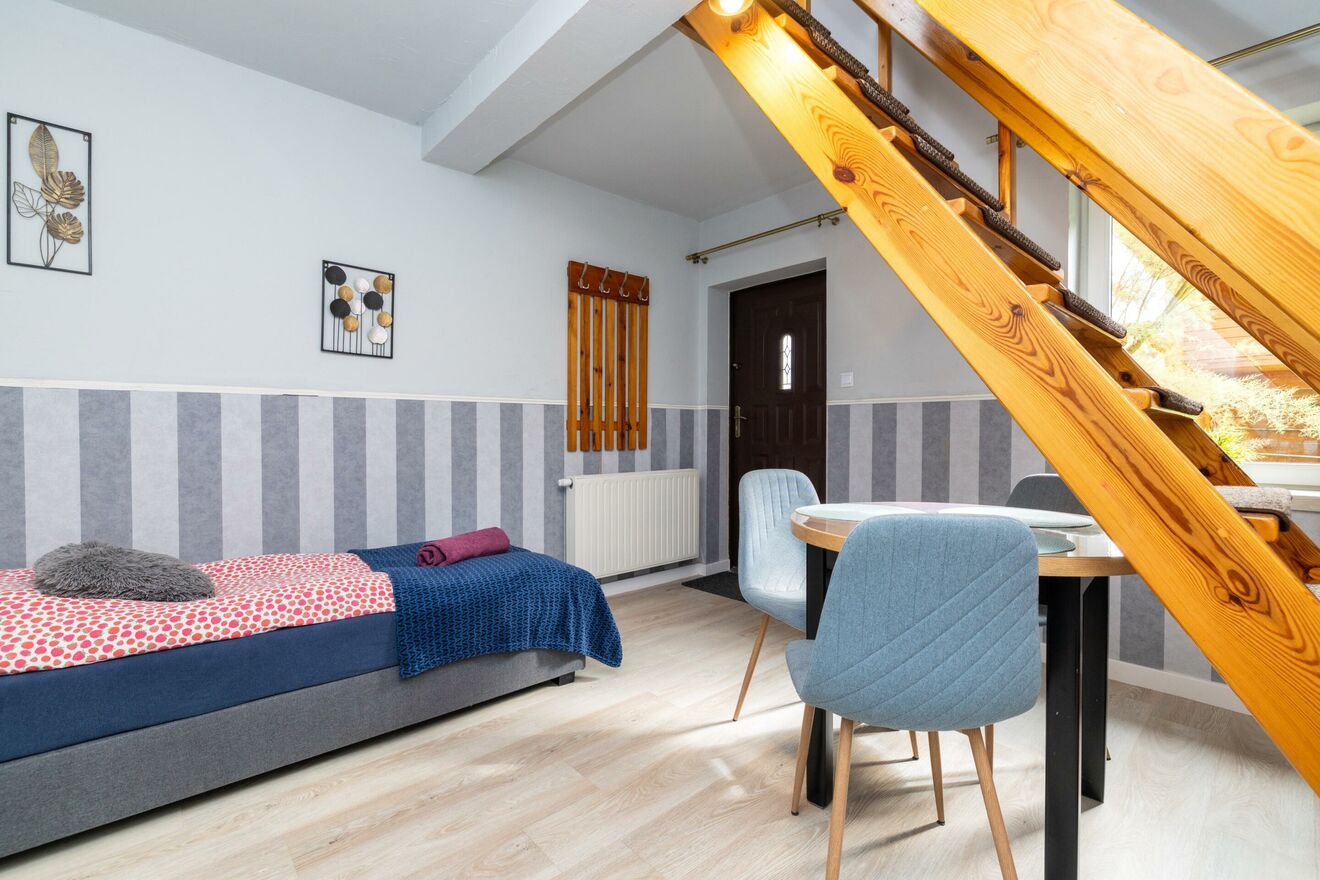 - 7 pokoi (3 jednopoziomowe oraz 4 cztero- i pięcioosobowe, dwupoziomowe z antresolą) - każdy pokój z własną łazienką i bezpośrednim wyjściem do ogrodu,